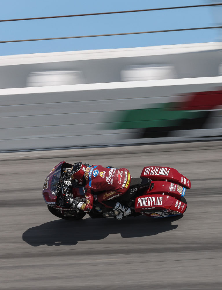 V roku 1909 sme vyhrali prvé motocyklové preteky, ktoré sa kedy konali na Indianapolis Motor Speedway. V roku 1937 vyhral Ed Kretz prvé preteky Daytona 200 na motocykli Indian Sport Scout. Pôvodná Wrecking Crew ovládla povojnovú závodnú scénu. V tejto tradícii sme pokračovali v roku 2010 v závodoch Flat Tracking Racing. Dnešní jazdci robia to isté v Bagger Racing League Europe a v sérii MotoAmerica King of The Baggers. Rôzne éry, rovnaký výsledok.